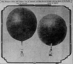 Oakland, California – October 24, 1909 – Ms. Margaret Miller and Ms. Genevieve Schaffer competed for the third time today in an aerial race. It will be remember that Ms. Miller became the first woman to win the Portola Cup, the prize awarded to the balloonist who travelled the farthest from their starting point; and that Ms. Shaffer also has a Portola Cup win to her credit. The two ladies are friendly rivals; Ms. Shaffer’s balloon, Queen of the Pacific, represents San Francisco, and Ms. Miller ascends in The City of Oakland.