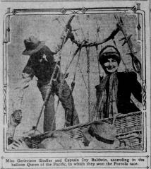 Ms. Shaffer, attired in a white veil and a street gown, ascended first. In between snaps of her ever present chewing gum, Ms. Shaffer told reporters, “I am not afraid at all…I have been looking forward to the trip with much pleasure for weeks.” At her signal, her assistant and the builder of the balloon, Baldwin, cut loose the ballast and Ms. Shaffer was away.