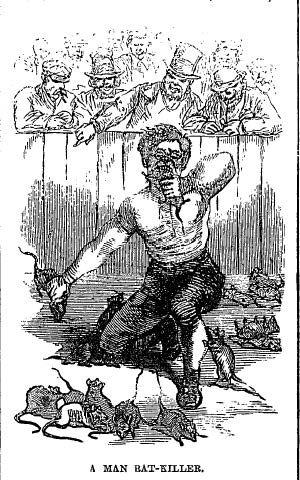 After ten or so of their compatriots had been dispatched in such a sundry manner, the rats figured out what was going on, and swarmed, crawling up the man’s thighs, but he was too quick for them. Rat after rat was crushed between the man’s teeth, the last terrified survivor cowering at the edge of the ring, until it too was killed.
