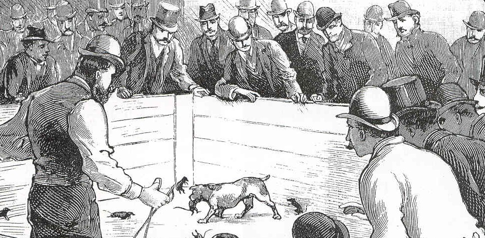 Rat-baiting was popular amongst the denizens of the pool halls and squalid taverns of the urban ghetto. The sport, if it can be called such, pitted a dog (usually a terrier or a pit-bull) against a ring full of rats; bets would be laid as to how long it would take the dog to kill all the rats, the average time per each rat death, or whether Dog A could kill 50 rats faster than Dog B.