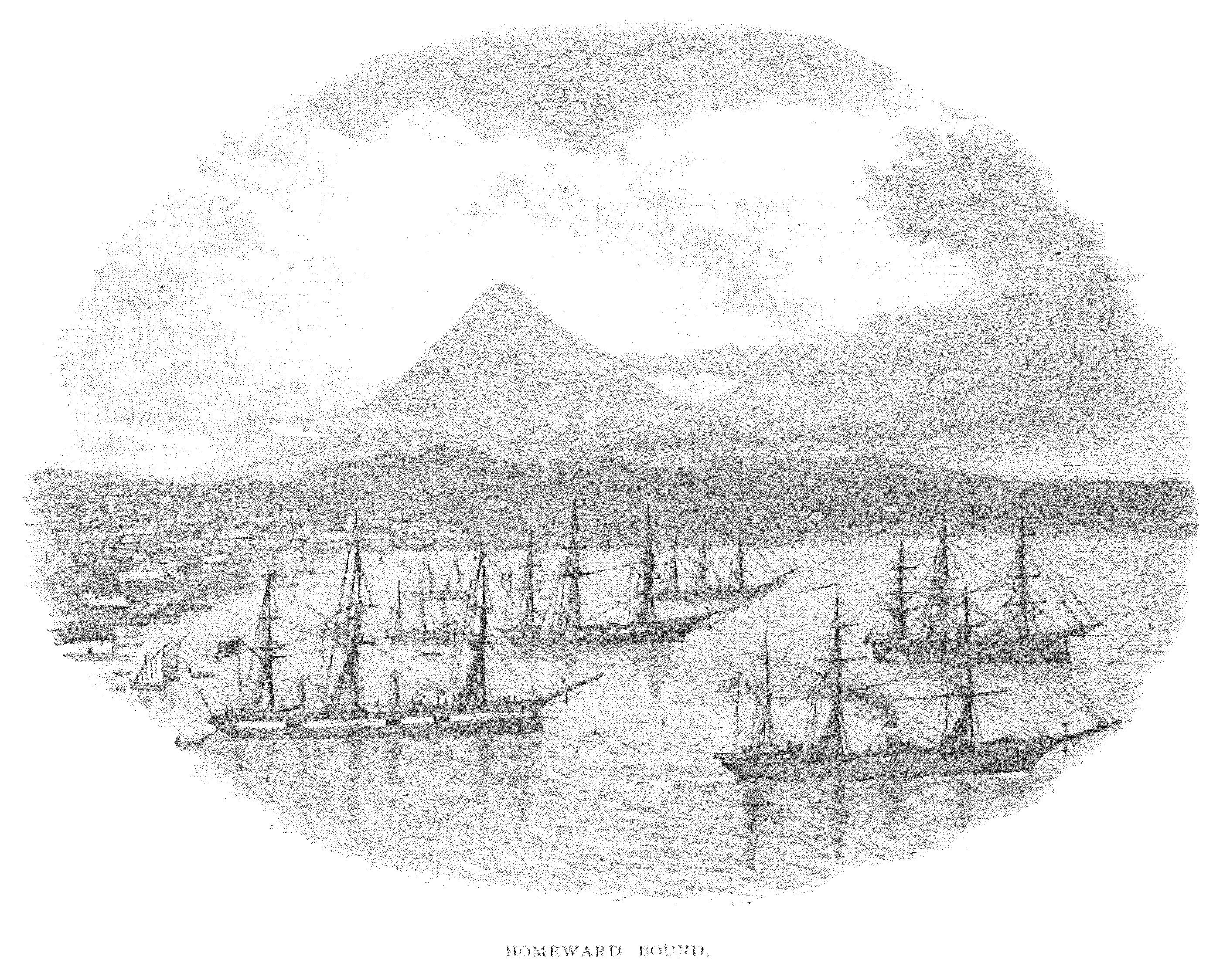 Her crew said last goodbyes to their friends aboard the various warships in Yokohama. The Ocean’s crew wished them an especially fond farewell, a shared battlefield experience made the two crews close. The Russian cruiser Vsadnick’s officers invited their counterparts aboard the Oneida to join them at a local photography studio; each crew hung a copy of the picture in their respective wardrooms.
