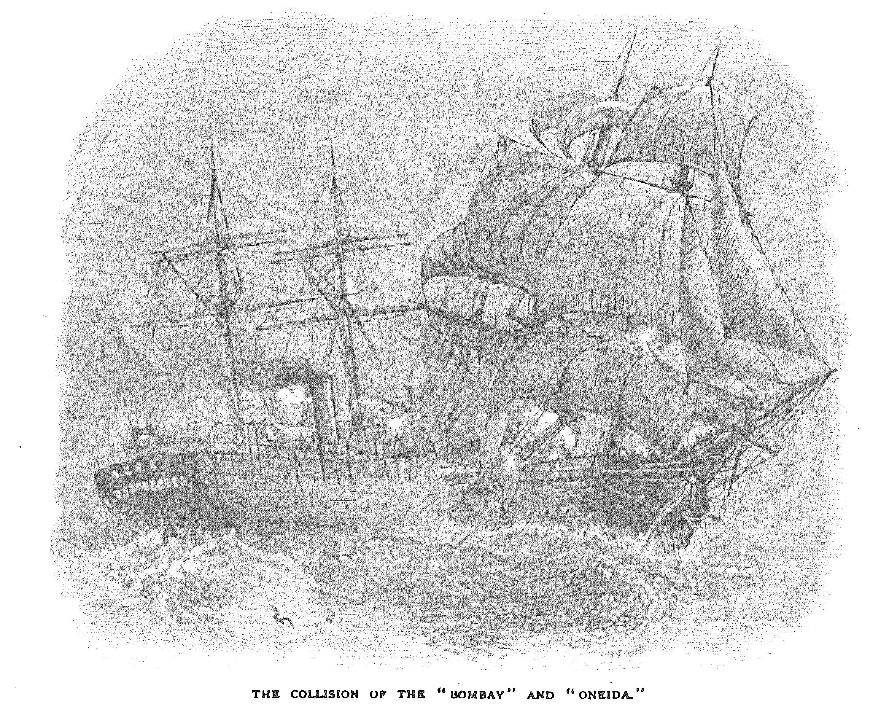 Bombay’s iron hull sliced off the entire rear quarter of Oneida just aft of her mizzen chains. Steaming away into the distance, Bombay carried with her Oneida’s spanker book and gaff. In the steamer’s guest dining room, two female passengers barely felt the collision, looked up momentarily, then resumed their game of bezique.